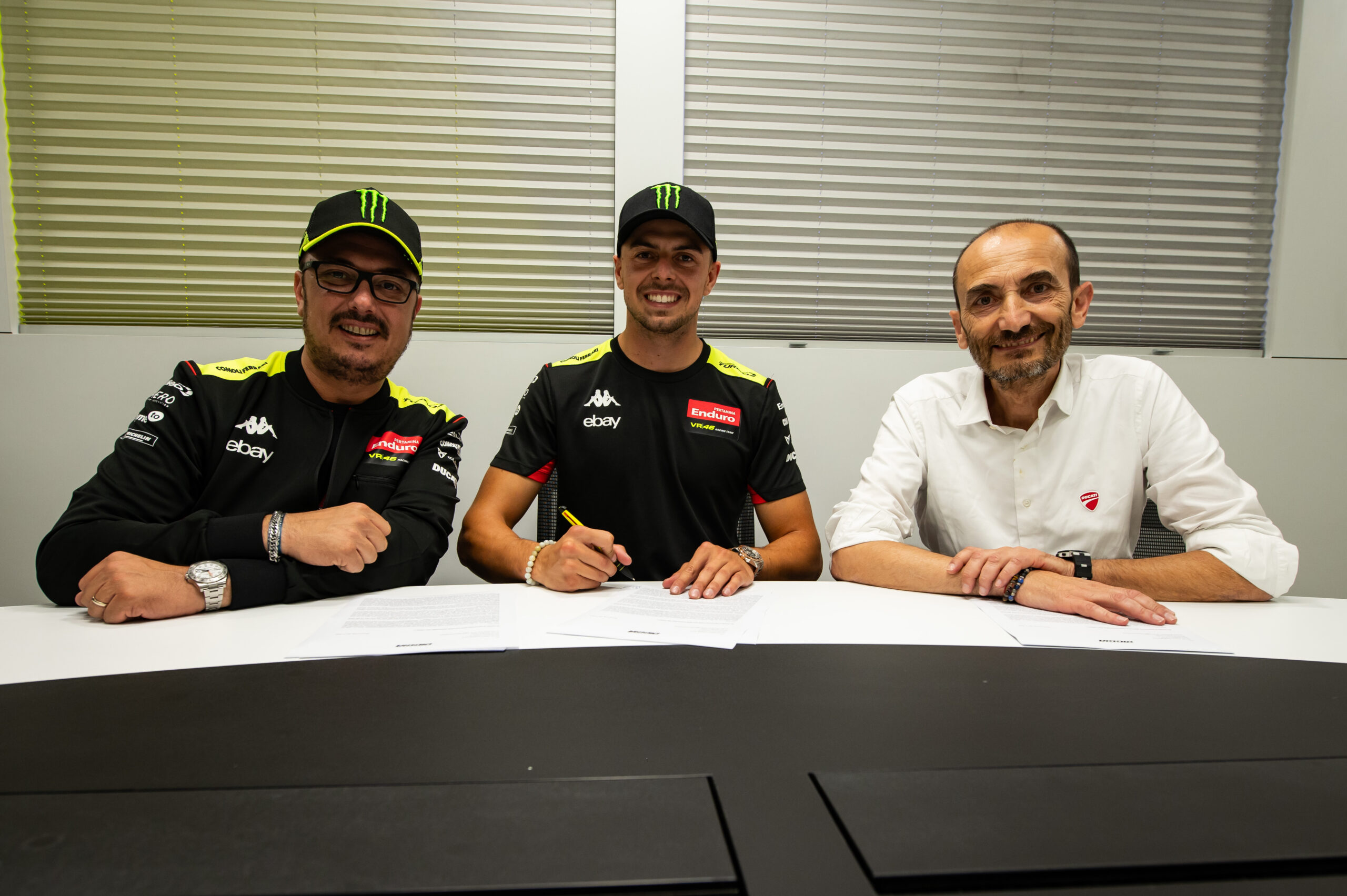 “9 mesi fa mi sono trovato senza moto per continuare il mio sogno e oggi firmo un contratto con due delle più importanti entità della MotoGP, è difficile da credere. Sono molto contento di poter proseguire questo viaggio fantastico insieme al Pertamina Enduro VR46 Racing Team e Ducati Corse per le prossime due stagioni. Sono arrivato qui quasi per caso, mi sono sentito subito a casa e con la squadra stiamo facendo davvero bene. Voglio ringraziare Vale, Uccio, Pablo, tutto il gruppo di lavoro, Ducati e il mio staff, non abbiamo lasciato nulla di intentato. Apriamo un nuovo capito, non vedo l’ora. Sarò in pista per due anni con la Ducati ufficiale, possiamo e dobbiamo puntare a raggiungere risultati ambiziosi. È un grandissimo progetto, dove mi sento coinvolto al 100% e possiamo lottare per il gradino più alto del podio. Continuiamo a lavorare, cresciamo weekend dopo weekend: questa è un’iniezione di fiducia ulteriore a dare sempre il massimo”.